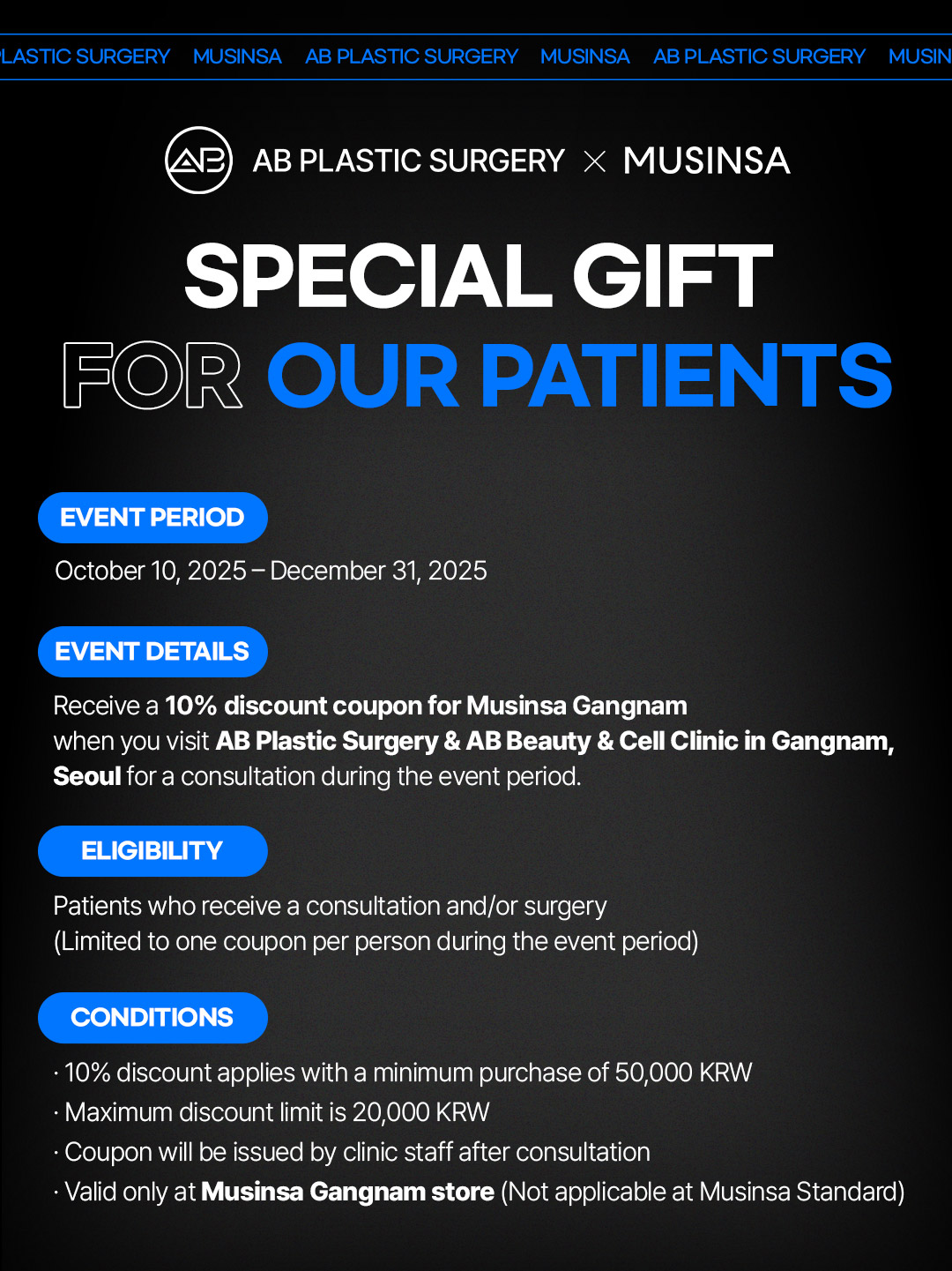 AB Plastic Surgery is dedicated to creating special experiences for our patients. Through this partnership with Musinsa Gangnam, we hope to offer not only top-quality medical and aesthetic care but also a rewarding lifestyle benefit. Visit us during the event period to enjoy your consultation and receive your special Musinsa coupon.
