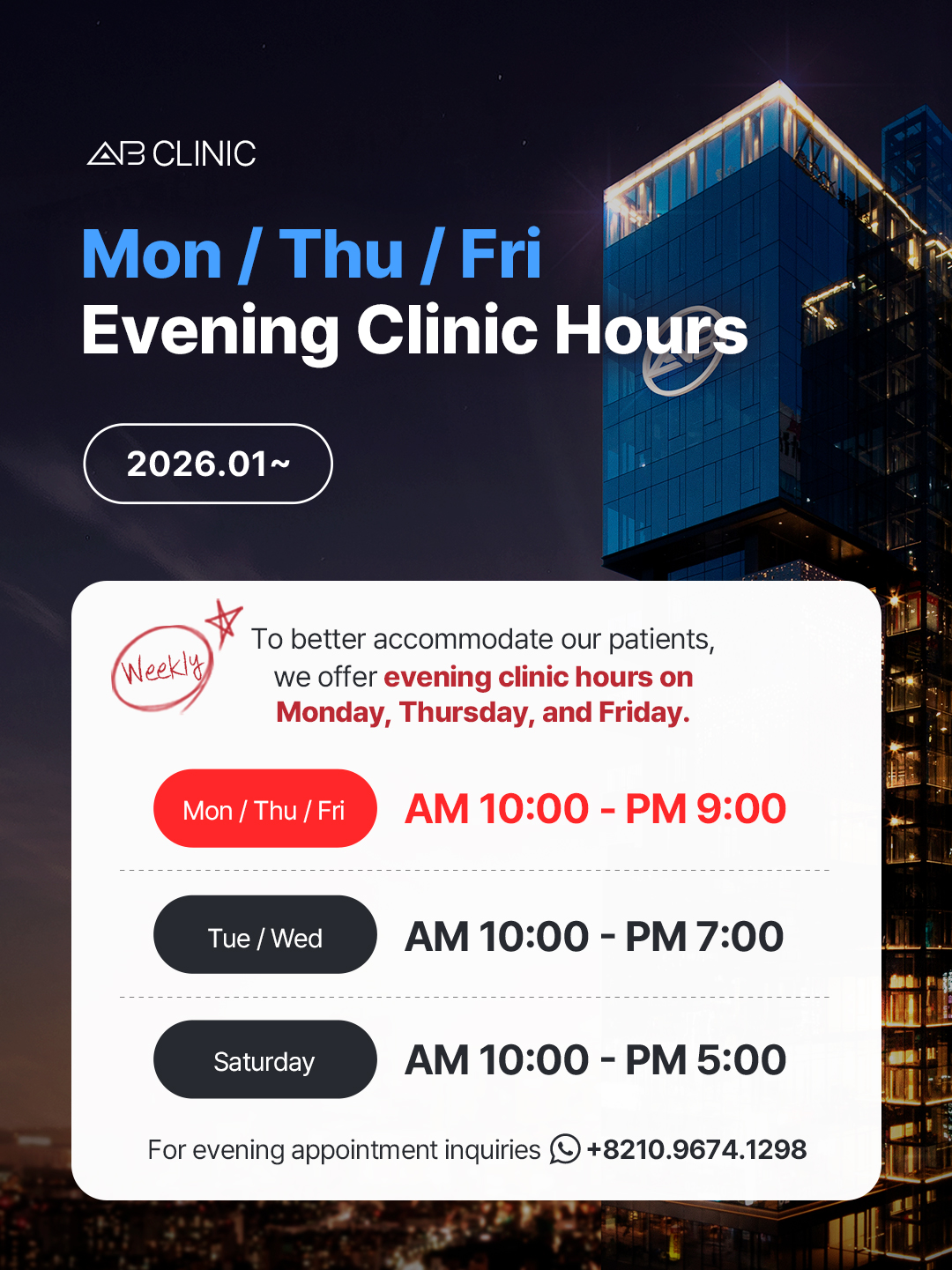 We would like to inform our valued patients that AB Clinic has extended its operating hours to better serve our clients and accommodate busy schedules.