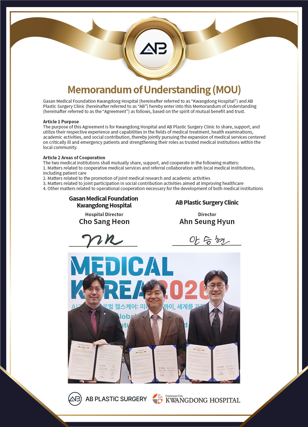 AB Plastic Surgery Clinic signed a Memorandum of Understanding, or MOU, with Gasan Medical Foundation Kwangdong Hospital for mutual cooperation at Medical Korea 2026, held at COEX in Seoul on March 19, marking the beginning of a more advanced medical cooperation system.