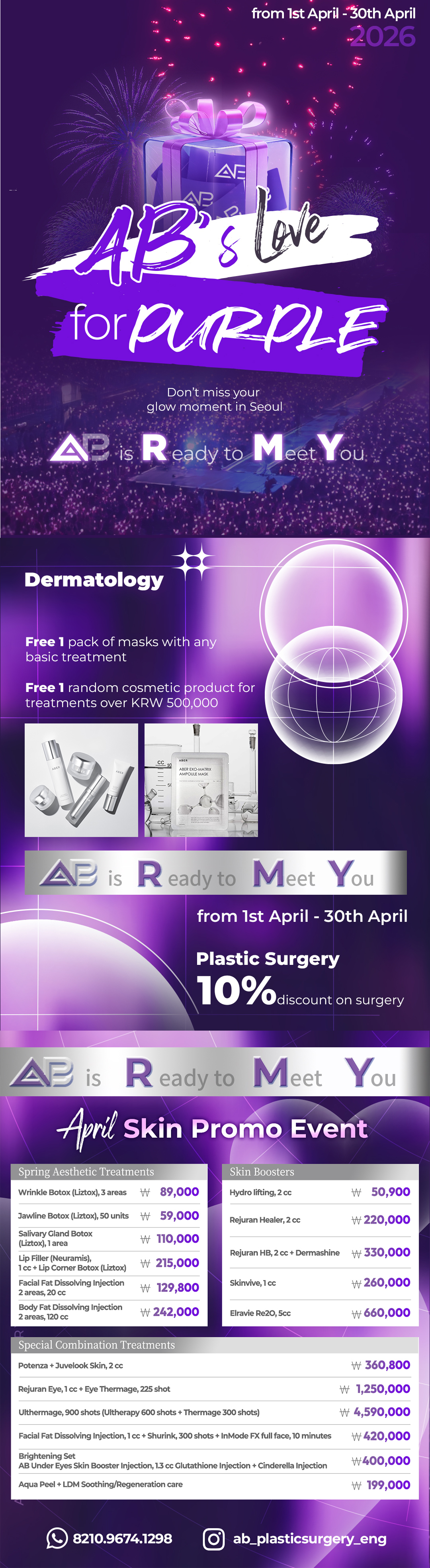 At AB plastic surgery, we are proud to offer personalized Korean aesthetic care with a focus on safety, balance, and natural results. For this special April promotion, we have prepared exclusive event benefits for both dermatology and plastic surgery patients, so you can enjoy your time in Seoul with even more reasons to shine.