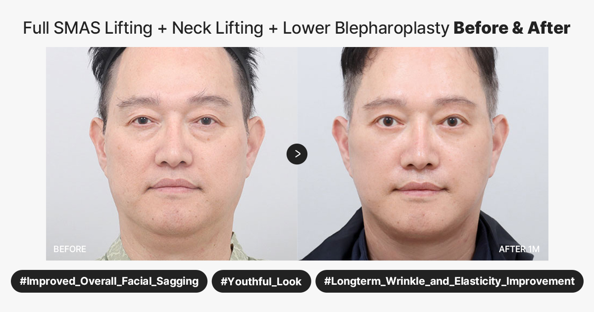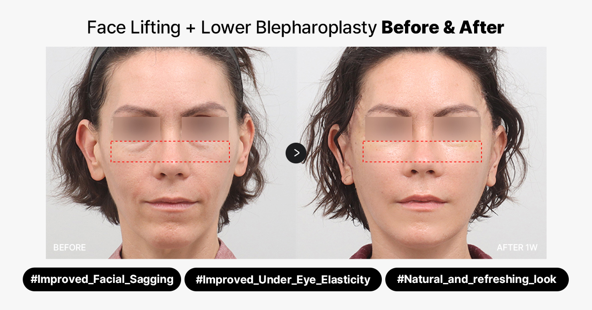 Therefore, if facelift surgery is performed on its own, the upwardly pulled skin may gather under the eyes, making wrinkles appear more pronounced. In reality, since aging-related sagging occurs across the entire face, many patients who undergo facelift surgery also choose to combine it with lower eyelid surgery. Patient reviews often mention that combining the two procedures provides results that look more natural and harmonious.