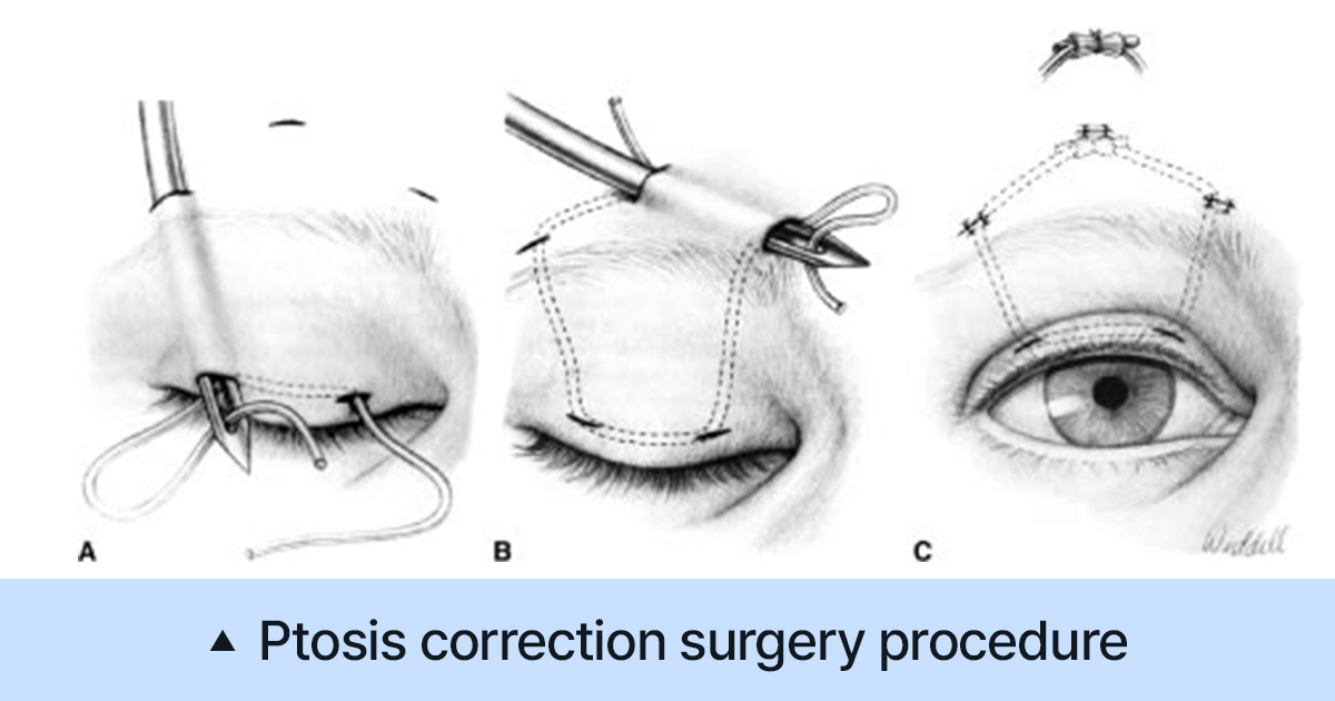 Through a small incision, the eyelid is attached to the frontalis muscle, allowing the patient to open their eyes using forehead strength rather than the weak levator.