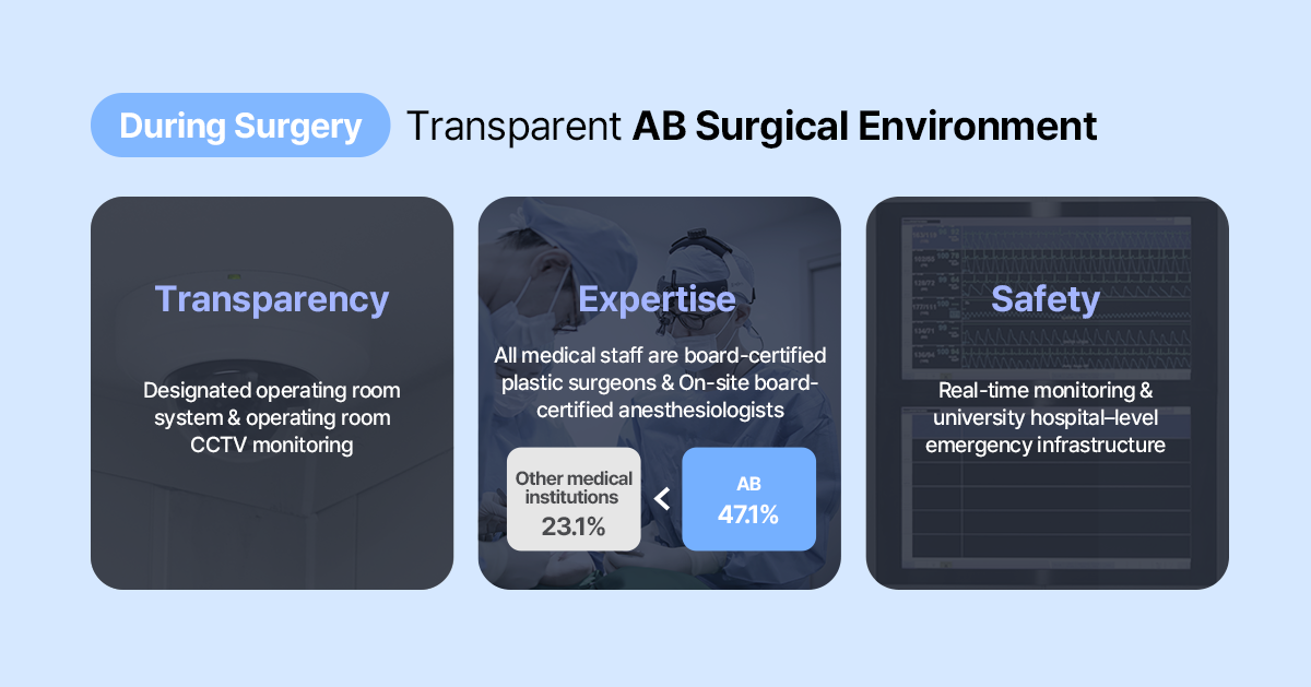 Today, I would like to introduce AB Plastic Surgery’s uncompromising safety management system—one that we consistently uphold from pre-operative preparation, through surgery, and all the way to post-operative recovery and discharge.