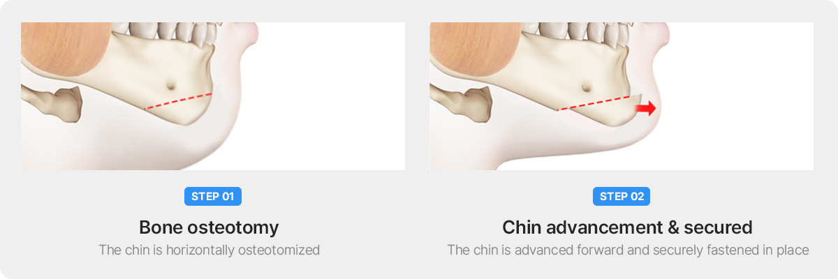 Chin implant is a surgery that improves the appearance of a chin by inserting an implant without cutting the jaw bone. It can be effective when the jawbone is not large and the chin is relatively mild. Although the surgery is simple and has the advantage of quick recovery, in cases where the chin is large and severe, chin implants alone may have limitations in improving the unevenness of the chin tip, hypertrophy of the chin muscle, and double chin phenomenon.