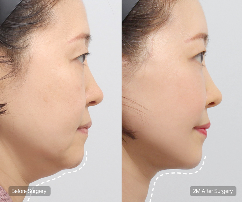 A double chin which is difficult to improve with non-surgical treatments is mainly caused by excess fat accumulation and loosened platysma muscles. This surgery addresses the root cause by removing double chin fat and tightening the platysma muscle located under the chin, thereby improving a sagging jawline and effectively preventing the recurrence of a double chin.