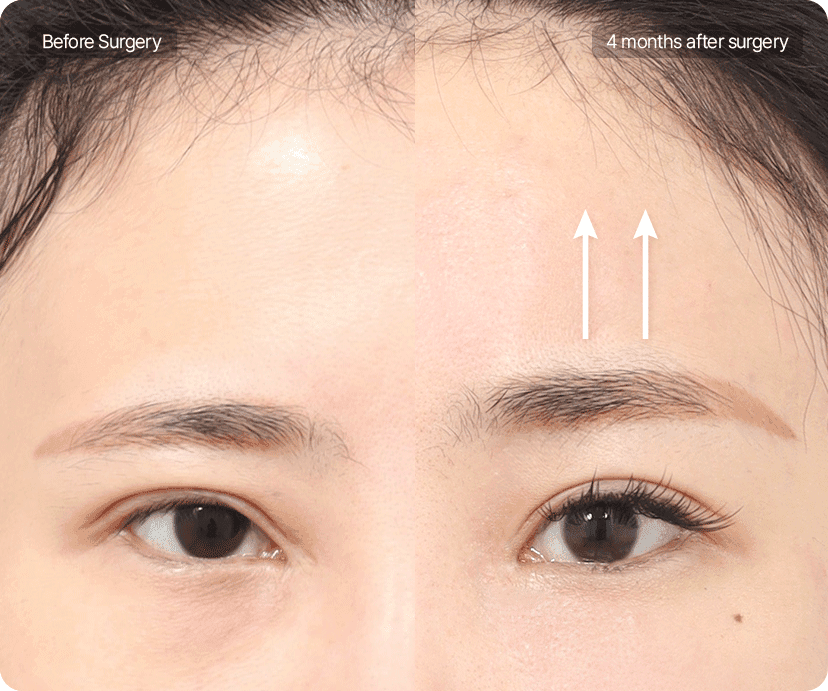 In such cases, performing an endoscopic forehead lift first to widen the space between the brows and eyes, and then combining it with double-eyelid surgery, can result in a more natural and balanced eye appearance.